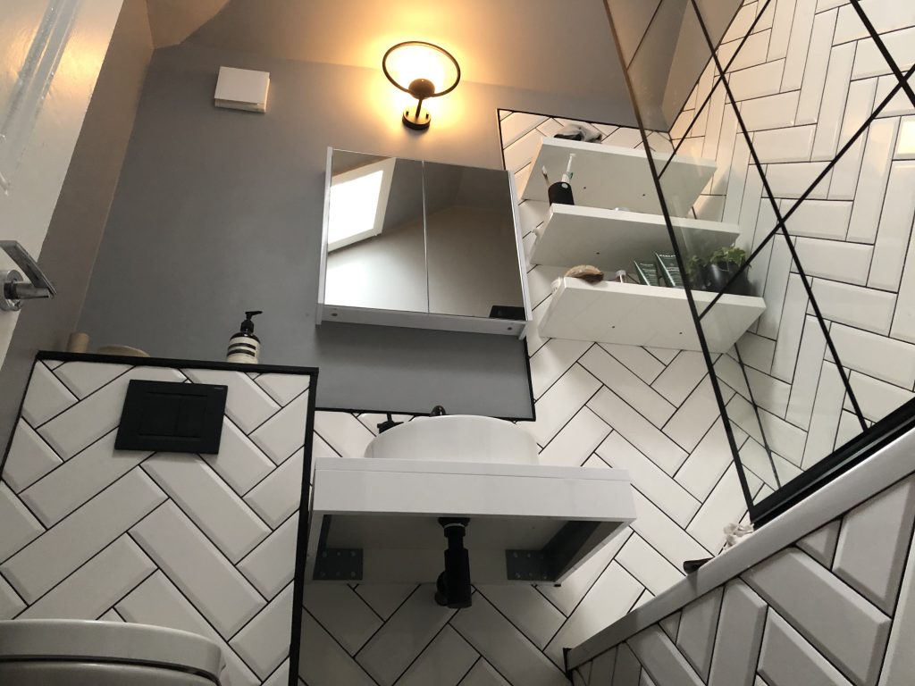 For the design, we decided to place the bathtub along one side of the room, giving it a nice, spacious vibe. On the side, we added some floating shelves, which not only look great but also offer a bit of storage and space for decorations. The walls got a fresh look with white herringbone-style tiles, giving the room a bit of texture and a clean, classic feel.